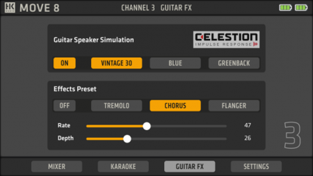 The HK Premium PR:0 Move 8 is a battery powered 60W speaker with three input channels plus a Bluetooth/aux input. Channels 1 and 2 have mic/line inputs, and channel 3 has an instrument jack socket as well as a special feature that makes it super useful for electric guitarists; alongside the input is a switch that engages a Celestion Speaker Impulse Response, effectively making that channel act like a powered guitar cab.